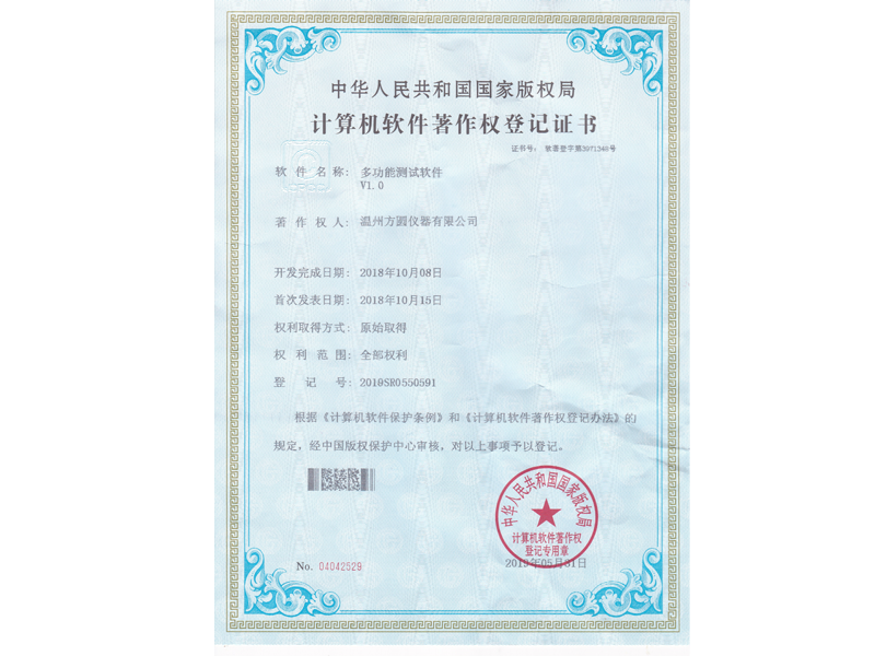 中華人民共和國國家版權(quán)局 計算機(jī)軟件著作權(quán)登記證書:多功能測試軟件V1.0(軟著登字第3071348號)