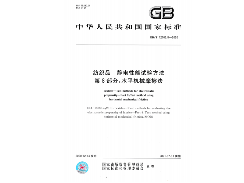 參與起草《紡織品 靜電性能試驗方法第8部分:水平機(jī)械摩擦法》(GB/T 12703.8-2020),該標(biāo)準(zhǔn)由國家市場監(jiān)督管理總局、國家標(biāo)準(zhǔn)化管理委員會于 2020-12-14 發(fā)布