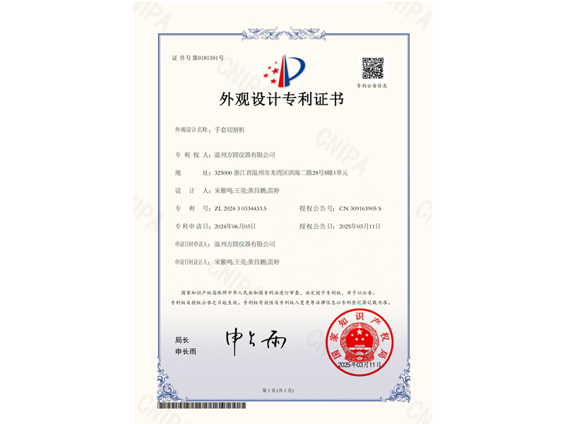 中國外觀設(shè)計專利:手套切割機(jī)(ZL2024 3 0334433.5)